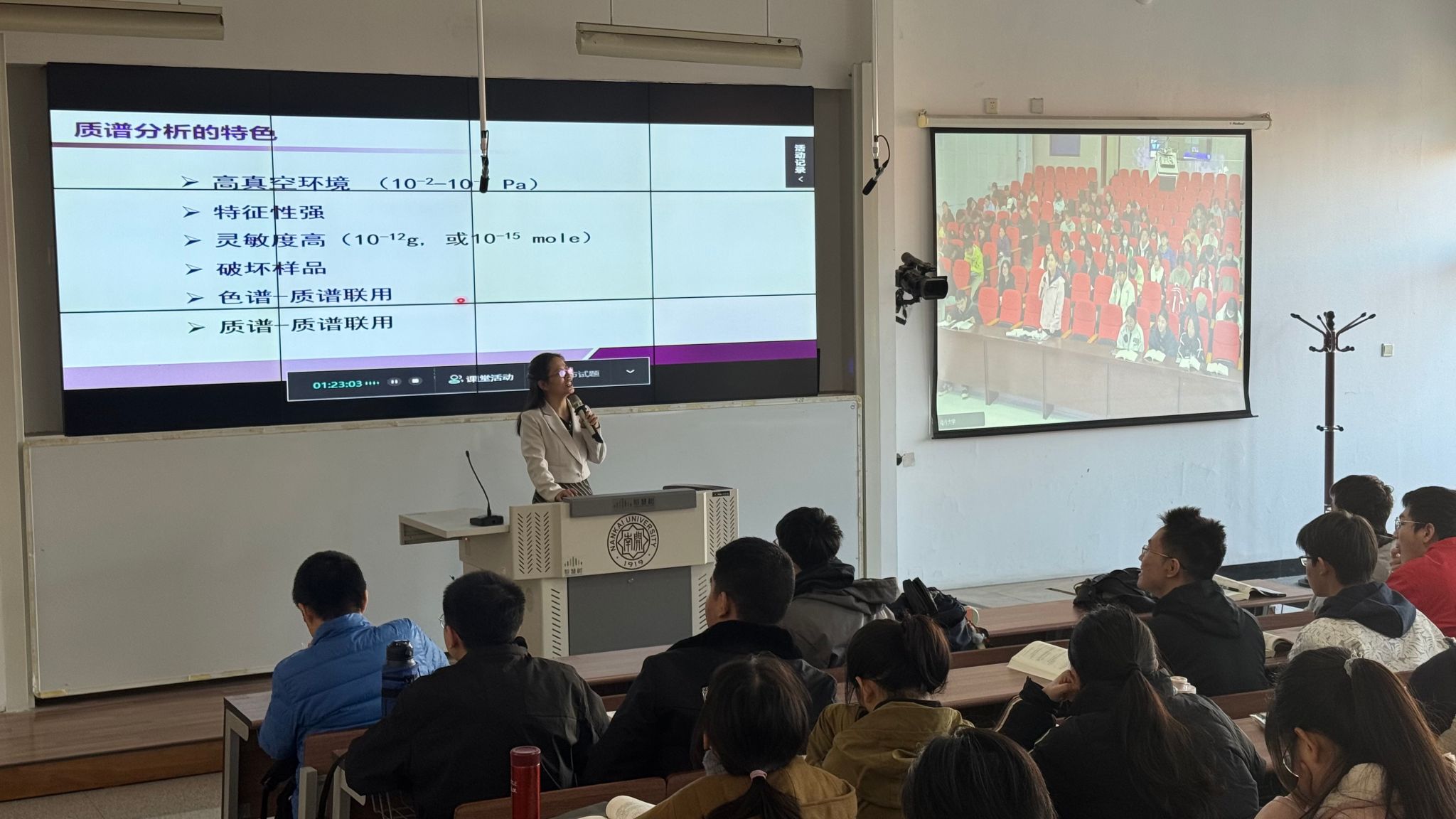 博士生导师王荷芳教授主讲“质谱分析法”,主课堂设在南开大学智慧教室。化学专业的200余名学生参加本次同步课堂,名师工作室成员、小欧视频