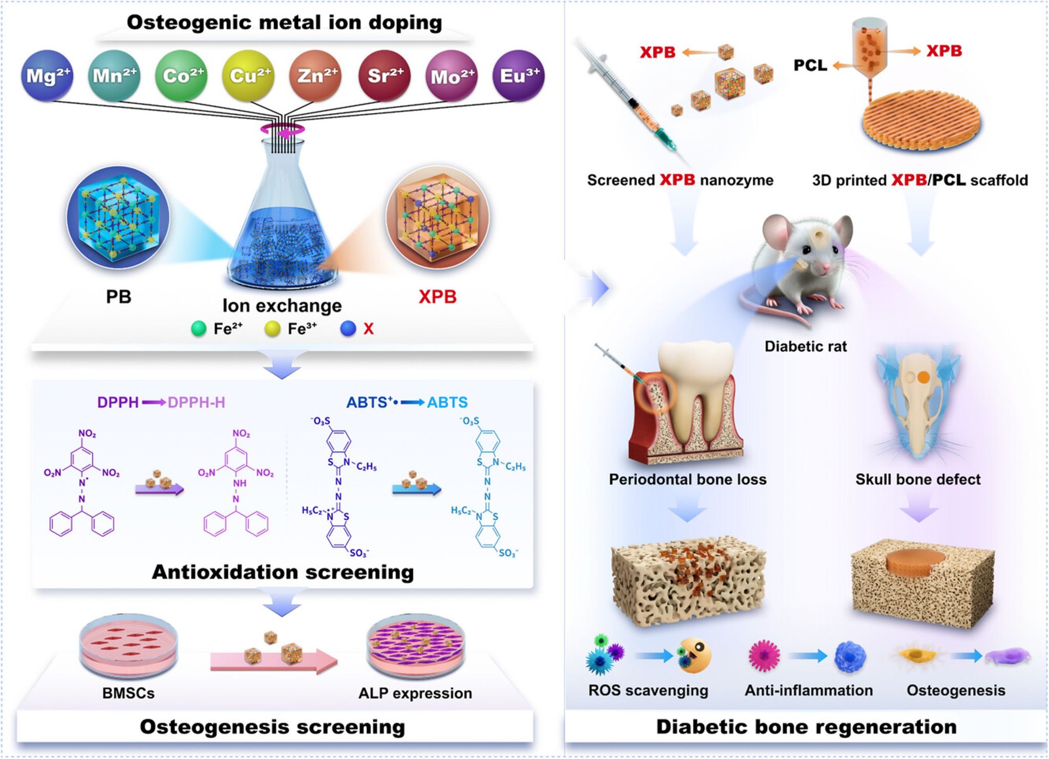 近日,小欧视频小欧视频 王英波教授团队在国际顶级期刊《Advanced Materials》上发表了题为“A High-Throughput Screened Copper-Doped Prussian Blue Nanozyme as a Diabetic Bone Regeneration Promoter with Integrated Antioxidant, Anti-Inflammatory, and Osteogenic Functions”的研究论文,该论文于2026年3月22日在线发表。