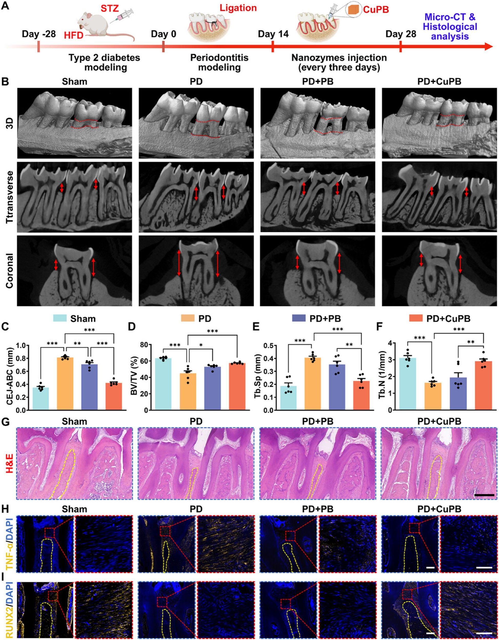 CuPB不仅能有效清除活性氧,还能通过可控释放铜离子激活细胞内PI3K-Akt信号通路,促进成骨转录因子RUNX2的表达,推动干细胞向成骨细胞分化及矿化。动物实验结果显示,CuPB能够显著促进糖尿病大鼠牙槽骨和颅骨缺损的修复,展现出巨大的临床应用潜力。